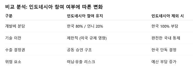 만약 인도네시아가 공동개발에서 이탈한다면 한국은 단기적으로 약 20%의 재정 공백을 감수해야 하지만, 장기적으로는 기술 보호와 사업 통제력 강화라는 긍정적인 효과를 얻을 수 있다는 분석이 제기되고 있습니다.