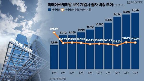 아울러 미래에셋생명 15.59% 지분에 대해선 1693억원, 베트남법인 100% 지분에 대해선 1091억원 등으로 장부가액을 메겼다. 또 계열사들과 함께 조성한 펀드 등 투자조합을 합쳐 장부가액으로 총 2조803억원 규모를 출자했다고 금감원에 보고했다. 이는 미래에셋캐피탈의 자기자본 1조3947억원 대비 149.2%에 달한다.
