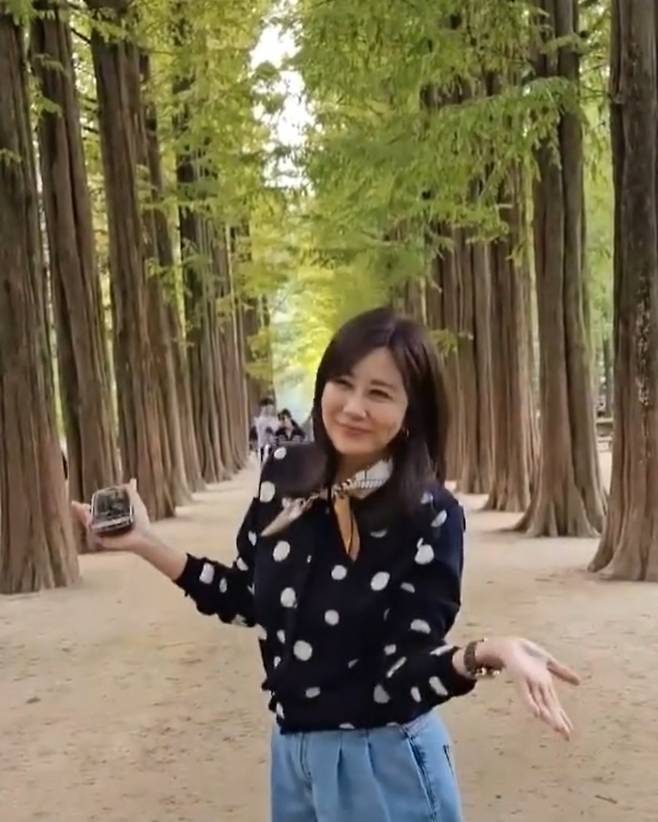 양정아가 편안하면서도 세련된 매력을 발산하는 도트 패턴 가을 나들이 룩으로 눈길을 끌었습니다.