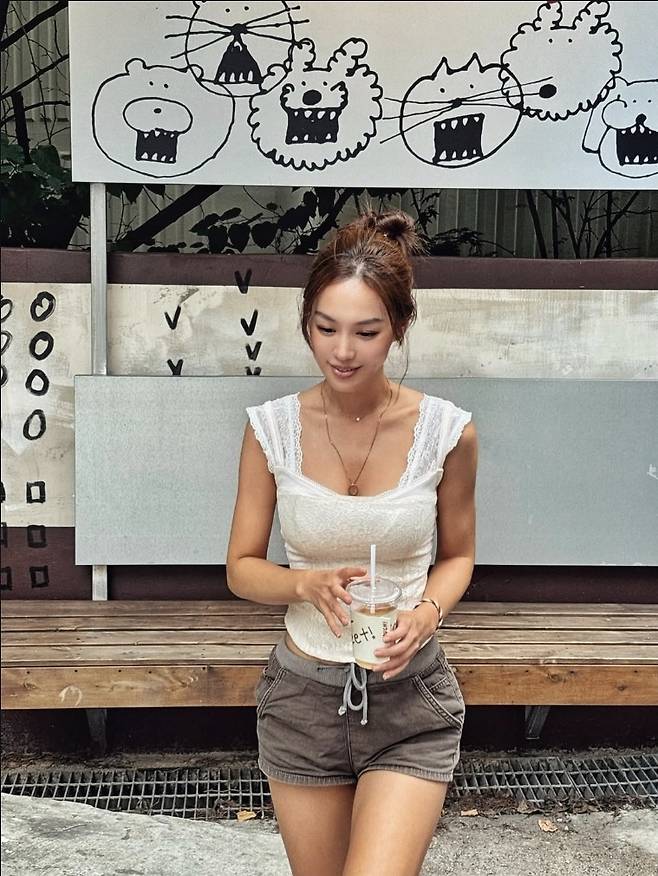 레이스 디테일이 돋보이는 화이트 슬리브리스 크롭톱에 카키빛 브라운 컬러의 쇼츠를 매치해 여름 무드를 극대화했습니다.