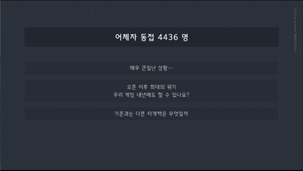 12일 동시 접속자 수 4436명이라는 수치를 보여주며 현 상황을 정확히 인지하고 있다고 전했다. 또한 앞으로 이터널리턴이 지향하는 목표로 "동시 접속자 수 2만 명 유지"를 내세우며 현 상황을 개선하기 위해 노력을 기울이겠다고 다짐했다.