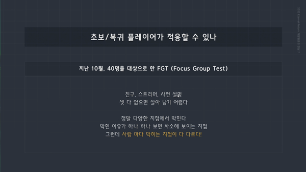A. 계속 플레이하는 비율이 올라갈수록 게임의 잔존율이 높아진다. 정식 출시 시기에 맞게 마케팅을 준비해 신규 유저들을 유입할 수 있게끔 하겠다.