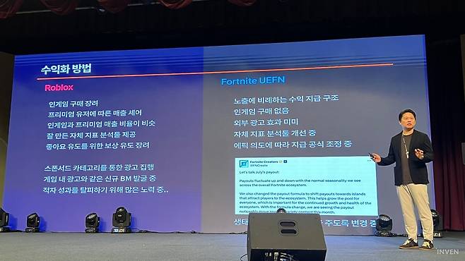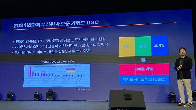 이를 두고 이득우 본부장은 패키지 게임과 유저들이 만들어가는 라이브 서비스, 두 차원으로 구분하는 안이 나오고 있다고 설명했다. 특히 최근 라이브 서비스 게임이 게임 시장의 33%를 차지하고 있고, 그중 로블록스와 포트나이트 등 UGC가 크게 성장하면서 시장에서도 많은 관심을 보이고 있다고 덧붙였다.