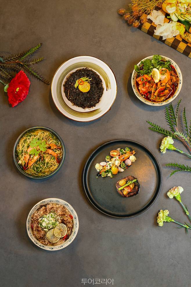 또한, 다양한 주류와 함께 즐기기 좋은 쌈장 소스를 곁들인 마늘쫑과 베이컨, 뿔소라와 해초누들무침, 가이양 치킨, 새우 해산물 떡볶이, 아귀간 구이와 간장절임 연어알, 모찌리도후와 쇠고기 고추볶음 뿐만 아니라 구운관자, 캐비어가 올라간 감태 리소토까지 푸짐한 퓨전 페어링 한상메뉴가 포함되며, 페어링 메뉴는 인원수에 따라 1인 1상으로 제공되는 것이 특징이다.