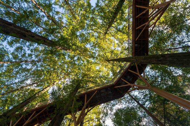 울창한 숲속을 따라 조성된 숲속 데크로드와 전망대, 아이들을 위한 숲속놀이터, 산림문화휴양관과 야영장, 그리고 출렁다리까지!