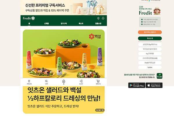 ‘프레딧’은 한국 야구르트에서 운영하는 온라인몰로 초기에는 생필품, 화장품 등 400개 수준의 품목을 판매했지만 현재는 타사 제품을 포함하여 약 1100여 개의 상품을 운용 중입니다. 전국에 퍼져 있는 기존 야쿠르트 배송망을 다른 정기구독으로 확대하고 있다는 것이 특징인데요, ‘프레시 매니저 배송’의 경우 전일 오후 4시까지 주문하면 자체 물류 시스템을 활용해 다음 날 상품을 받아볼 수 있습니다. 프레딧은 벌써 가입 회원 수가 200만 명을 넘었으며 점점 영역을 넓혀나가고 있습니다.