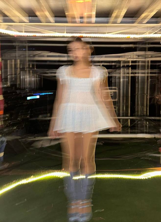 공개한 사진에서 제니는 속옷이 비치는 푸른색 시스루 미니 스퀘어넥 원피스를 입고 귀여운 바비 같은 요정미를 발산했다.