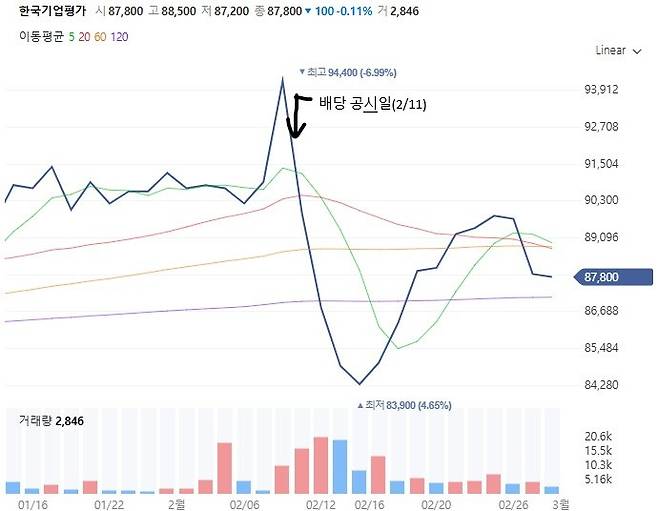 그런데 올해 배당금은 3954원. 전년보다 주당배당금을 20%나 낮추며 주주들의 기대를 무너뜨렸습니다. 그렇다 보니 배당 공시 직전엔 주가가 상당히 올랐었는데, 공시가 나오자마자 당황한 투자자들이 매물을 쏟아내면서 주가도 상당히 하락했습니다.