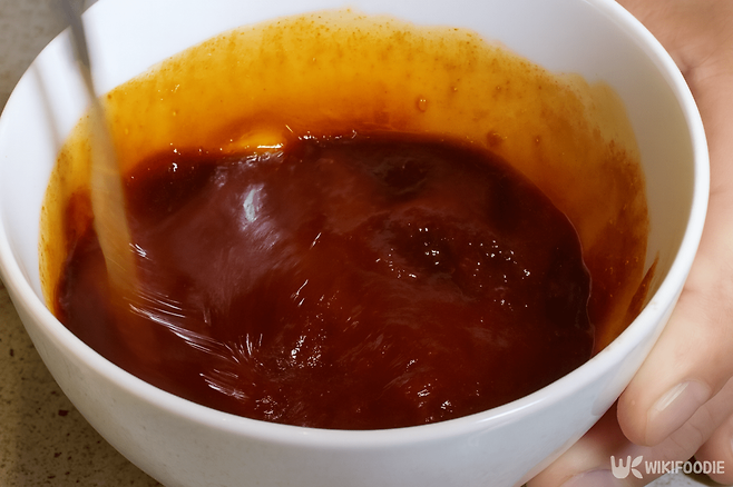 황태채가 밑간에 충분히 젖어 들었다면 이제 양념장을 준비할 차례다. 양념장은 간단하다. 고추장 3스푼, 간장 3스푼, 꿀 2스푼, 다진 마늘 2스푼을 넣어 잘 섞어준다. 꿀 대신 올리고당을 써도 되고, 매실청이 없다면 매실 음료를 활용해도 된다. 이 양념장은 맵고 달콤하며 짭짤한 맛이 균형 있게 어우러진다.