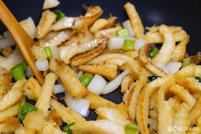 5. 팬을 중약불에 올리고 황태채를 짧게 볶는다.