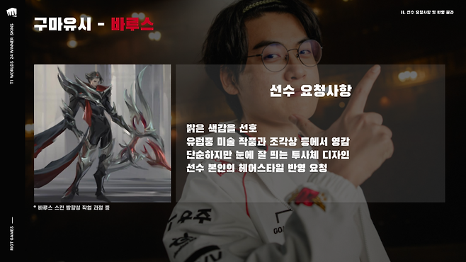 '구마유시' 이민형은 바루스 스킨에 밝은 색감을 선호한다고 밝혔다. 또한, 유럽풍 미술 작품과 조각상에서 영감을 받은 디자인과 본인의 헤어스타일을 반영해달라고 요청했다. 귀환 모션은 2024 롤드컵 결승 진출전에서 크루아상을 먹으며 "잇츠굿"을 외쳤던 세리머니를 그대로 담았다. 개발진은 구마유시의 아이디어가 스킨에 대한 비전을 수립하는 데 큰 도움이 되었다고 전했다.