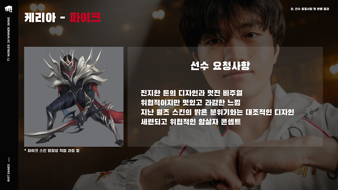 '케리아' 류민석은 파이크 스킨에 진지한 톤과 대비되는 세련되고 위협적인 암살자 콘셉트를 제안했다. 그가 요청한 귀환 모션은 T1 함선을 배경으로 두 개의 롤드컵 트로피가 담긴 보물상자와 T1의 깃발을 꽂는 장면으로 구현되었다. 개발팀은 이 아이디어가 일반적인 작업 범위를 넘어서는 큰 아이디어였기 때문에 가장 기억에 남는다고 밝혔다.