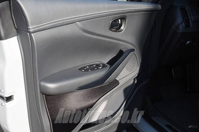 소재는 두말 할 필요가 없다. 눈에 보이는 거의 모든 부분이 가족으로 덮여 있고 저렴한 플라스틱 흔적은 어디에도 찾아볼 수가 없다. 심지어 천장을 비롯해 햇빛가리개, 별도의 손잡이까지 전부 질 좋은 가족으로 감쌌다. 도어 안쪽과 센터 터널은 통 카본을 씌웠고 굵직한 화이트 스티치는 신선함을 살린다.