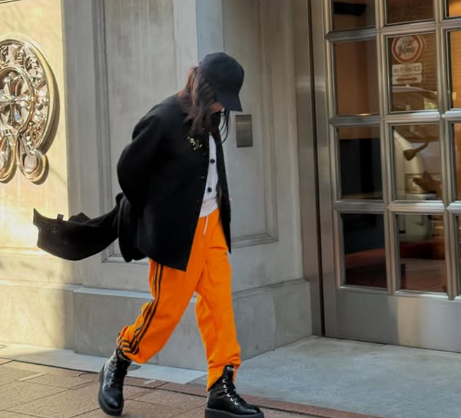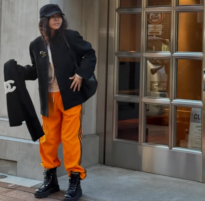 샤넬 트위드 자켓과 주황색 트랙팬츠로