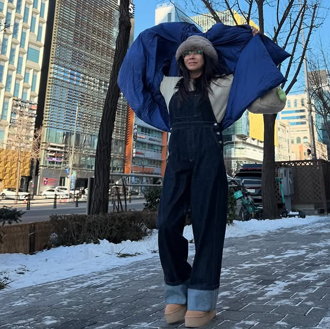 높은 어그부츠로 겨울룩을 완성했죠.