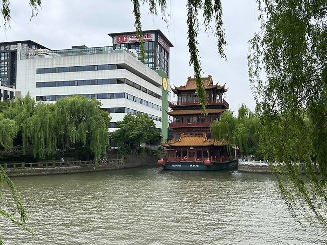 저녁 8시쯤 작은 골목 안쪽에 위치한 호텔에 도착했을 때는 거리 전체가 불야성이었는데, 이른 아침 산책길에 나서니 수변을 따라 만들어진 아담한 마을 느낌이다. 우리가 묵은 호텔 바로 옆 호텔이 Cheery Canal Hotel Hangzhou라는 곳이었는데, 설명을 보니 건물 전체가 역사문화보호 복합건물로 11개 국가의 공장을 개조해 만든 곳이라 한다. 처음에 이곳을 예약했다가 취소를 했었는데, 나중에 오게 되면 한 번 묵어봐야겠다.