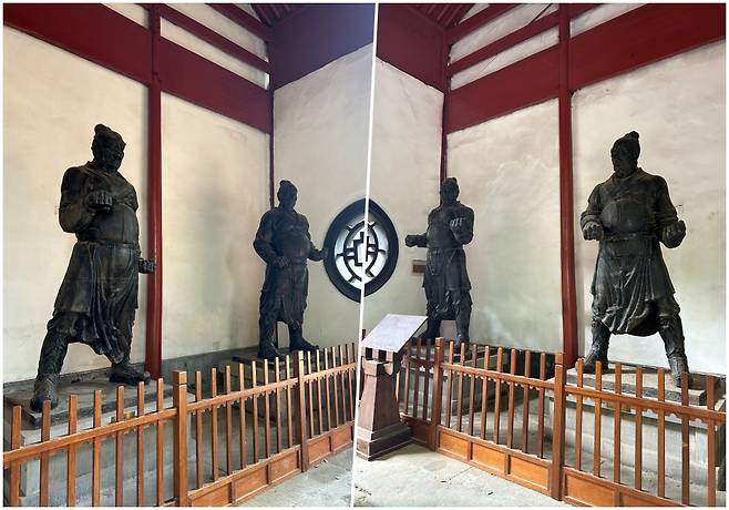입구로 들어서니 불교 사찰처럼 사대천왕 같은 조각상 4개가 무서운 표정으로 내려다보고 있다. ‘티에꺼꺼(铁哥哥)’라는데, 항저우성의 백성들을 보호해주는 신이라는 설명이다.
