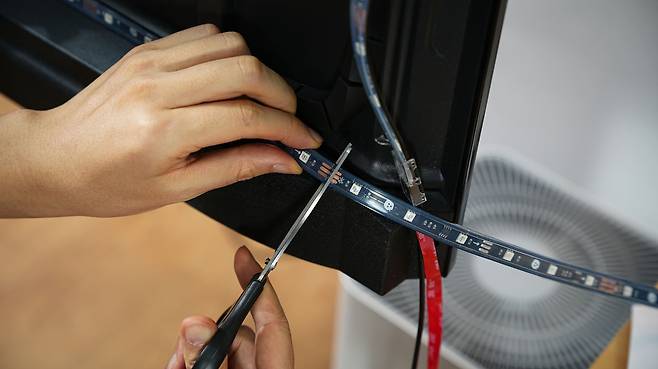 먼저 브래킷에 양면 테이프를 붙입니다. TV마다 후면 디자인이 다르지만 최대한 바깥쪽으로 설치하면 LED 광량이 넓게 퍼질 수 있습니다