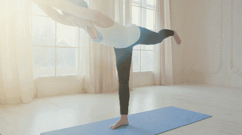 매트에 서서 오른발로 체중을 지탱하며 왼발을 뒤로 곧게 뻗습니다. 동시에 상체를 앞으로 숙여 몸이 T자 모양이 되도록 유지하고, 팔도 앞으로 뻗습니다. 자세를 유지하며 반복한 뒤, 이번에는 왼발로 버티면서 오른발을 뒤로 뻗어 같은 방식으로 진행합니다.
