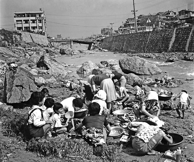 | ▲ 도림천(1977) 수해를 당했는지 곳곳이 부서진 도림천 모습. 개울물로 머리감기와 빨래 등을 해결하는 모습을 볼 수 있다. |