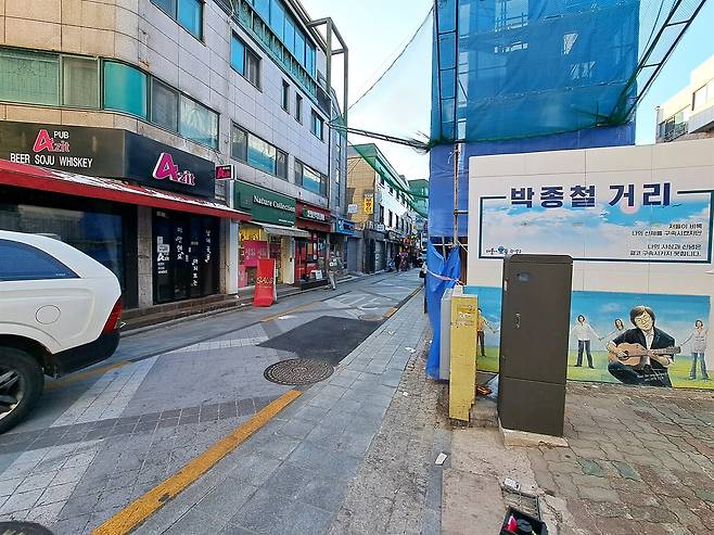 | ▲ 박종철 거리 녹두거리 인근에 명명한 '박종철 거리'의 풍경. 공사 중인 건물은 박종철 기념관으로 추정된다. |