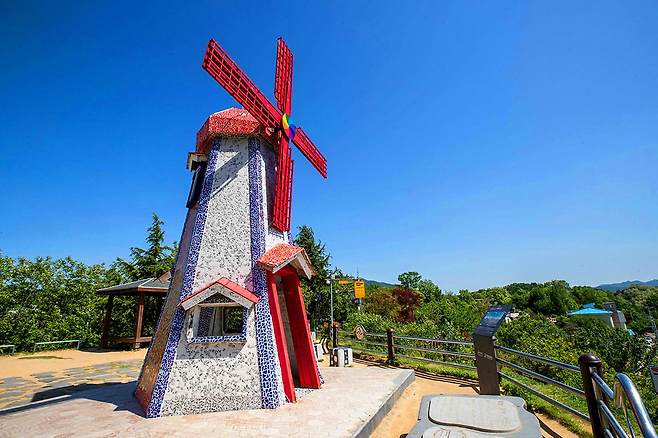 대동하늘공원은 대전 동구 8경으로 손꼽히는 명소로 2009년 ‘대동마을 쉼터 사업’을 통해 달동네 언덕마루에 조성된 공원입니다. 알록달록한 색감과 이국적인 풍경을 간직한 풍차와 사랑 바위는 수많은 관광객의 발길을 끌어당기는 상징물입니다.