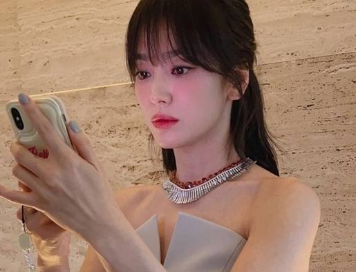 송혜교는 연그레이 여신 드레스를 착용하고 앞머리, 반묶음 헤어로 동안 미모를 뽐냈다.