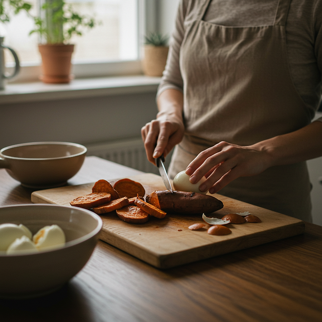 대신 고구마, 삶은 계란이 조합은 포만감도 오래가고,혈당도 안정적입니다.