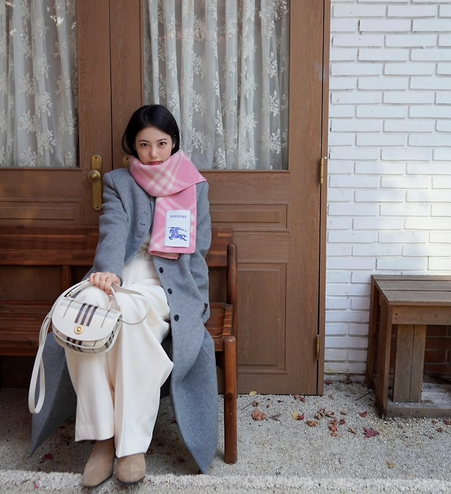 핑크 컬러 버버리 머플러의 매력을 확실하게 보여준 스타일이다.
