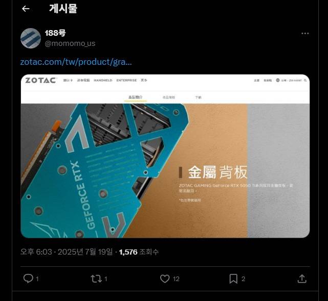 해외 소식통 내용을 정리하면 조텍 홈페이지에 RTX 5050 Ti에 대한 언급이 나오면서 시장에 영향을 주는 것 같습니다. 다양한 정보를 흘리는 188호(@momomo_us)는 X에 RTX 5050 Ti를 언급한 조텍 홈페이지 이미지를 함께 등록해 두었습니다. 정확한 정보는 나오지 않았기에 모든 내용은 추측입니다. 일부는 이 RTX 5050 Ti에 16GB 메모리를 올리는 게 아니냐는 이야기가 있으나 실현 가능성은 낮아 보입니다.