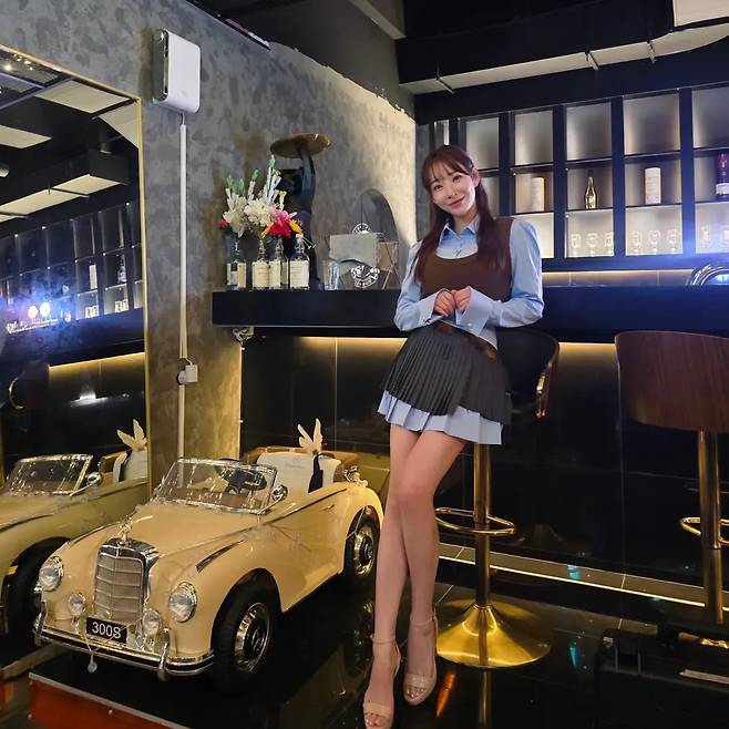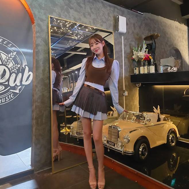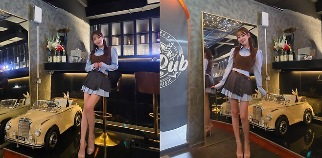 여기에 A라인으로 퍼지는 플리츠 미니스커트를 매치해, 잘록한 허리와 긴 다리 라인을 강조하는 '패션 고수'의 면모를 보여주었습니다.