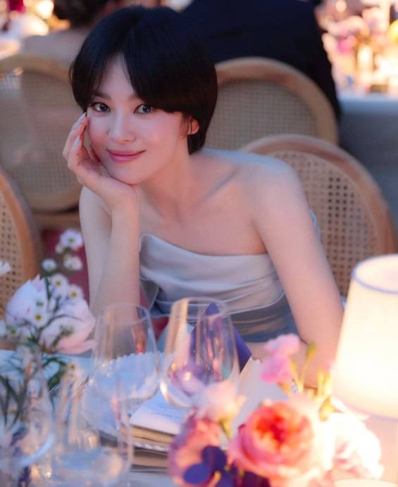 분위기 좋은 플라워 테이블, 와인 잔과 조명 아래에서 빛나는 피부, 그리고 그 미소 하나로 모든 장면을 장악하는 송혜교.
