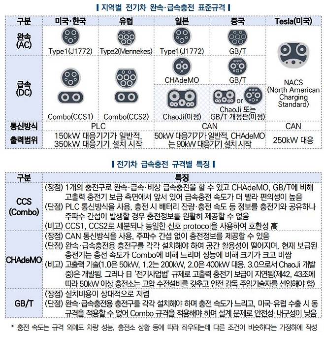 급속충전 표준규격은 미국·유럽·우리나라의 CCS(이하 Combo), 일본의 CHAdeMO, 중국의GB/T 외에 Tesla의 독자규격이 병존하고 있으며, 규격 통일 시 편의성 향상·비용 절감 가능하다. 충전기와 전기차에 적용된 규격이 다른 경우 호환성 문제로 충전이 원활하지 않을 가능성이 있으며 다양한 표준규격이 병존함에 따라 추가 비용이 발생하고 있다. 자동차 제조사는 동일 차량의 충전 설계를 지역별로 변경해야 하며 소비자는 호환 장비를 구매해야 한다.