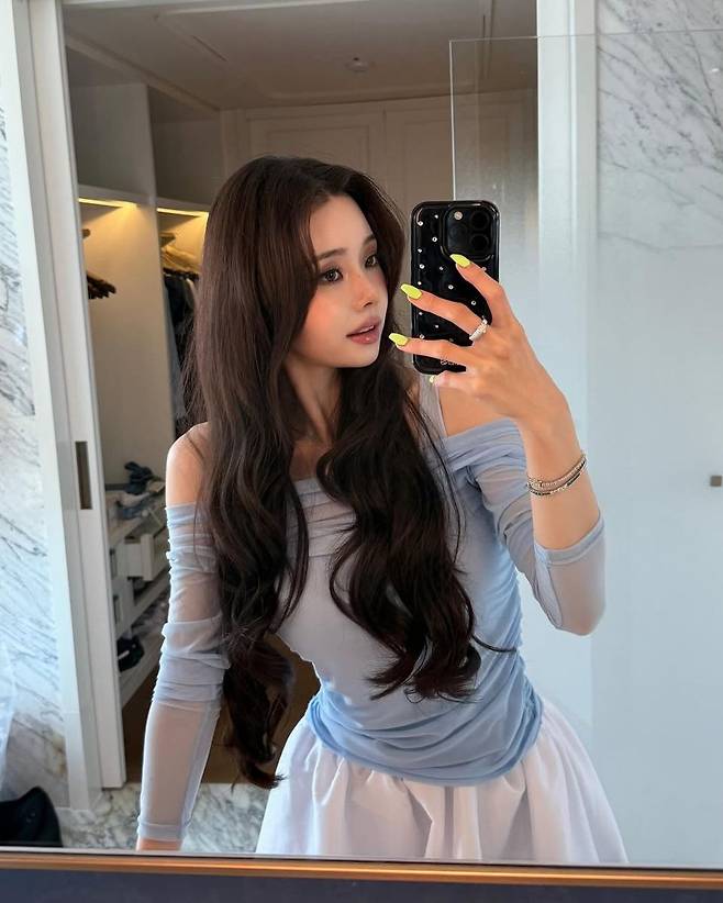 헤어스타일 역시 전체적인 무드와 찰떡이다. 풍성하게 흐르는 다크 브라운 웨이브 헤어는 얼굴 윤곽을 부드럽게 감싸주며, 전체적으로 우아한 실루엣을 완성한다. 흰 민소매 톱으로 꾸안꾸 스타일링을 더해 일상 속에서도 따라 하기 쉬운 데일리룩을 제안한 셈이다.