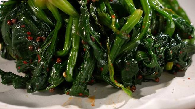 시금치무침은 딱히 특별할 거 없는 반찬처럼 보일 수도 있다. 하지만 고춧가루와 들기름이 더해지면 그 맛이 전혀 달라진다. 이 조합은 그야말로 시금치무침을 전혀 다른 차원으로 끌어올린다.