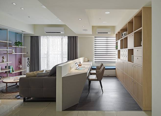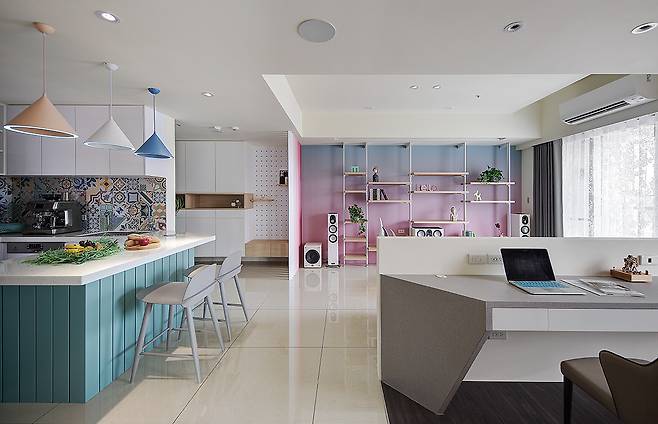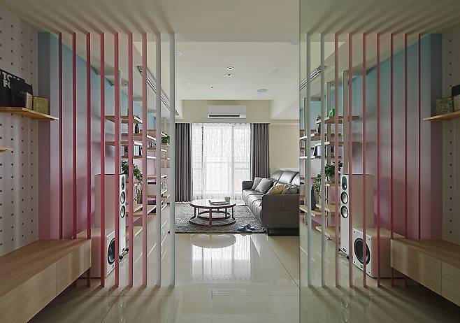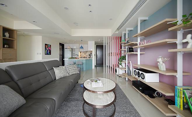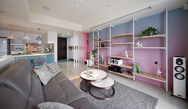 TV 대신 프로젝터. 벽 대신 추억을 담은 선반. 거실의 변화는 꽤 과감했다. 기존 TV 벽을 없앤 자리에 프로젝션 스크린과 스피커가 자리를 잡았고, 그 배경으로는 청록과 핑크가 미묘하게 번지는 벽지가 걸려 있다.