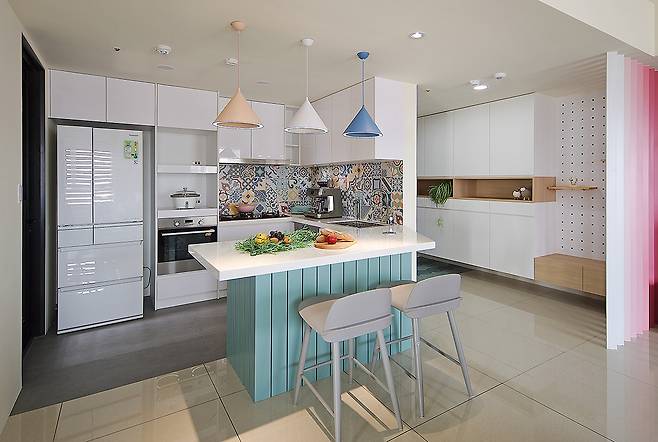 좁고 답답했던 기존의 주방 구조는 사라지고, 식탁과 아일랜드 키친이 감정의 중심으로 자리했다. 푸르게 눌러준 청록의 색감은 과시보다 절제의 미덕으로 자리하고, 토템 무늬의 타일과 제트블랙 스톤은 이국적인 재미를 더한다.