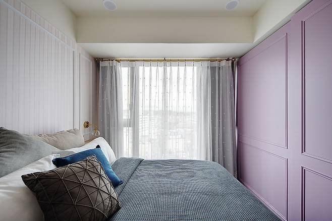 회색의 평화를 입은 침실은 하루를 마무리하기 가장 좋은 장소다. 옅은 분홍색 헤드보드와 입체적인 몰딩을 통해 단조로움을 극복하고, 양방향 슬라이딩 도어 옷장은 공간을 보다 부드럽게 확장시킨다.