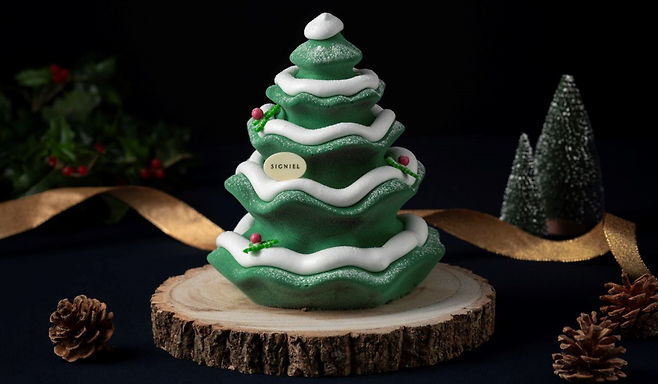 두 번째 스몰 럭셔리 케이크는 ‘롯데호텔 시그니엘 부산 크리스마스 트리’. 가격은 105,000원이다. 트리 위에 몽글몽글한 눈이 쌓인 디자인이다. 아로마테라피 및 스트레스 감소 효과가 있는 자스민을 첨가한 초록색 무스, 부드러운 지바라 크레뮤와 바삭한 아몬드 두자, 머랭을 넣어 만들었다.
