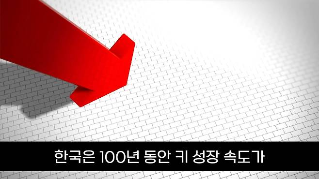 그런데 한국인들도 처음부터 아시아에서 가장 키가 컸던 것은 아니었다고 합니다. 1914년 한국 남녀의 세계 신장 랭킹은 전세계 200개 나라 중 여성의 랭킹은 196위, 남성의 랭킹도 151위로 상당히 작은 편에 속했습니다. 그런데 대한민국의 평균 키가 100년 만에 20cm 이상 자라면서 2014년 대한민국 남녀의 신장 랭킹은 여성이 55위, 남성이 51위까지 올라갔습니다. 한국은 100년 동안 키 성장 속도가 가장 빠른 나라라고 하는데요. 그리고 지금도 대한민국의 평균키는 성장하고 있는 중입니다.