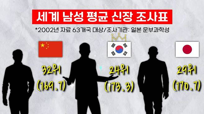 이러한 사실은 자료로도 확인할 수가 있습니다. 2002년 일본에서 발표한 '세계 남성 평균 신장 조사표'에서도 한국인의 평균 키가 아시아에서 가장 큰 것으로 조사되었고, 10여 년이 지난 2017년 연구에서도 같은 조사 결과가 나왔습니다. 이렇게 세계적으로 아시아권에서 한국인의 평균 키가 가장 크다는 것은 꽤 오래 전부터 알려진 사실이었죠.
