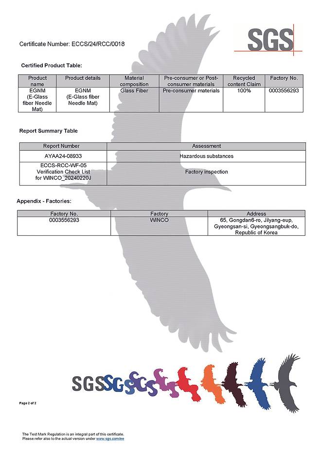 친환경 제조 공법 유기물을 거의 사용하지 않고 제품을 생산하며 주요 심재에 사용되는 E-glass Fiber Needle Mat에 들어가는 원재료는 리싸이클링 재료라는 인증서를 보유하고 있어 단열재시장에서 친환경에 앞장서고 있다.