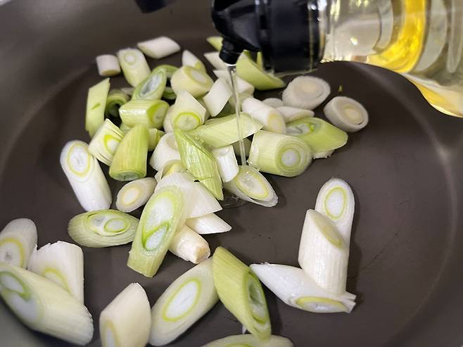 대파는 어슷썰기 한 후 식용유를 넣고 약불에서 볶습니다. 이렇게 볶으면 파 향이 어우러져 맛있는 파기름이 생성됩니다.