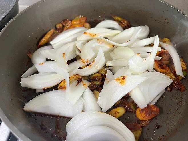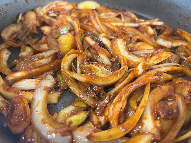 양파가 살짝 투명해지고 양념과 잘 어우러질 때까지 약불로 볶아 주세요.
