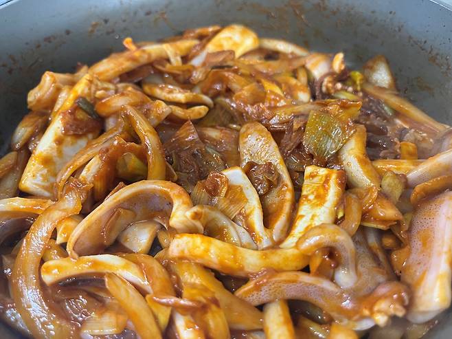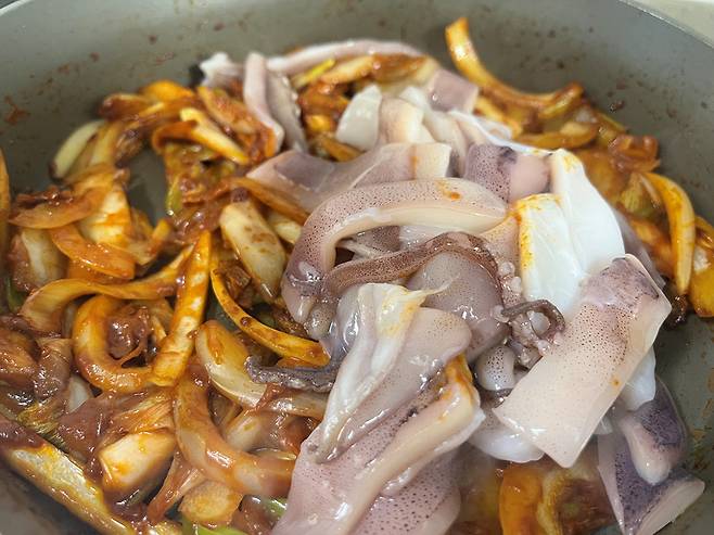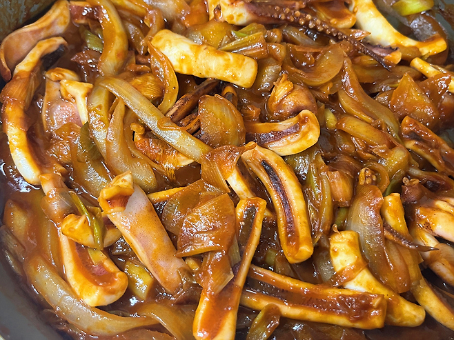채소가 어느 정도 익으면 오징어를 넣습니다. 오징어는 너무 오래 조리하면 오히려 식감이 질겨지기 때문에 강한 중~강불에서 빠르게 볶아내는 것이 좋습니다.
