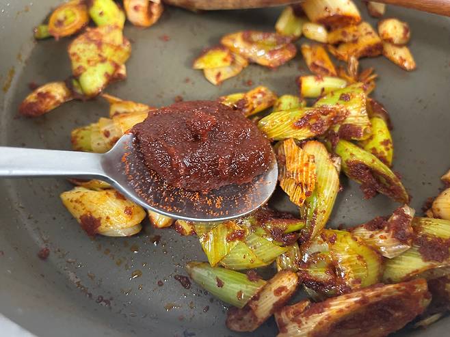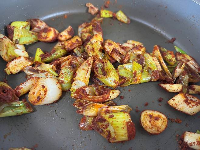 대파가 투명해지고 향이 우러나기 시작하면 고춧가루 1스푼을 넣고 같이 볶습니다. 고춧가루를 기름에 먼저 볶아 사용하면 맛과 향을 극대화할 수 있습니다.