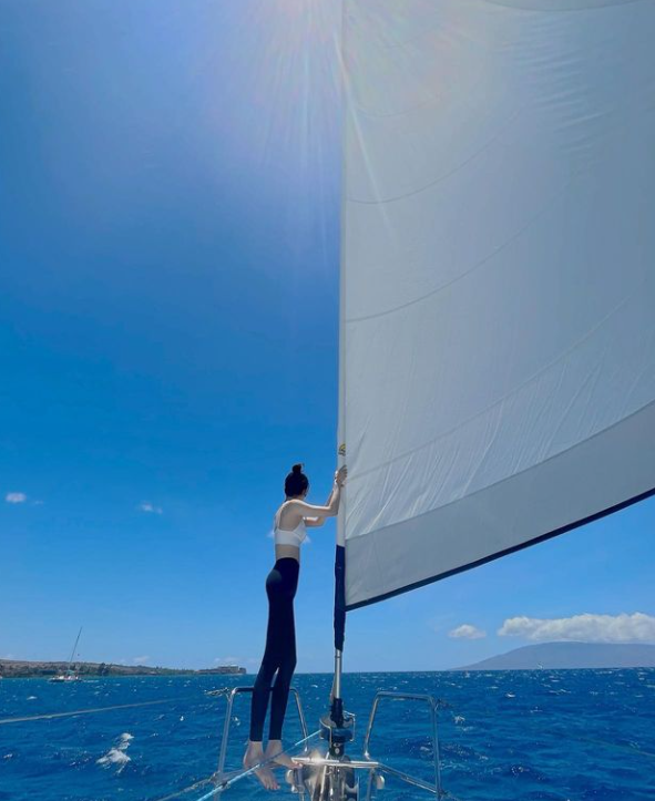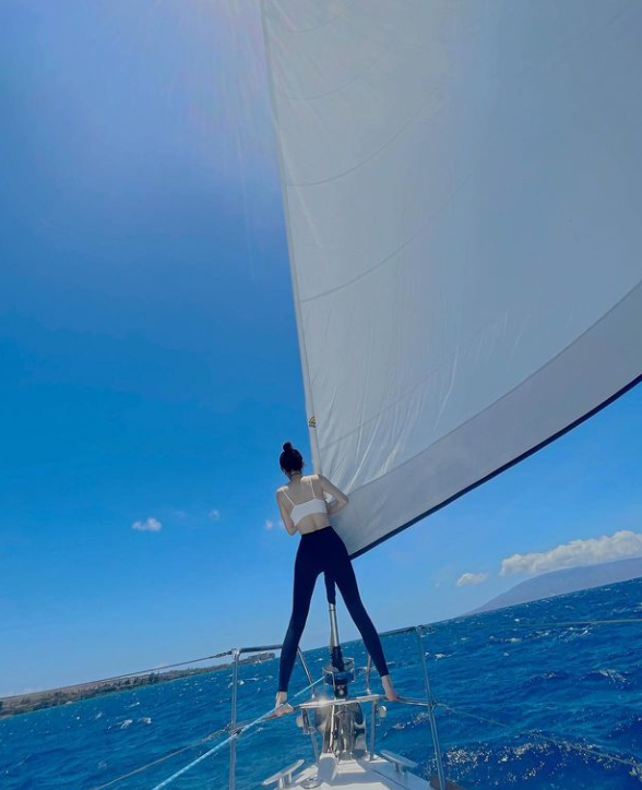 강민경은 헤어를 올려묶고 애슬레저룩으로 청량감 넘치는 여행룩을 선보였다.