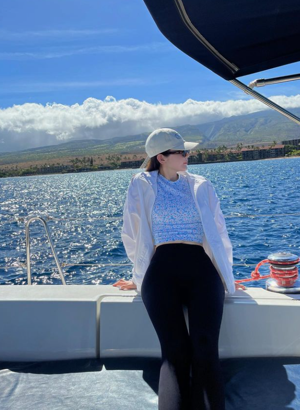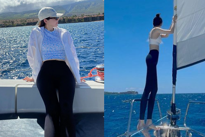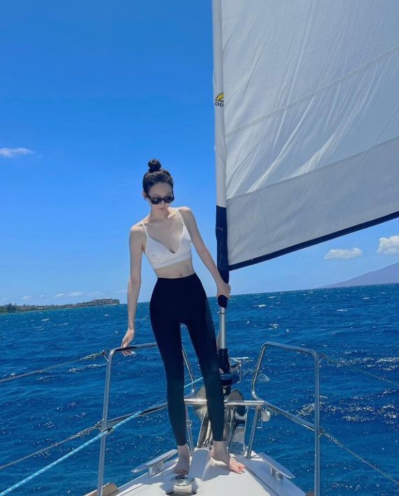 강민경은 플라워 패턴 상의에 레깅스 하의를 입고 바캉스룩을 완성했다.