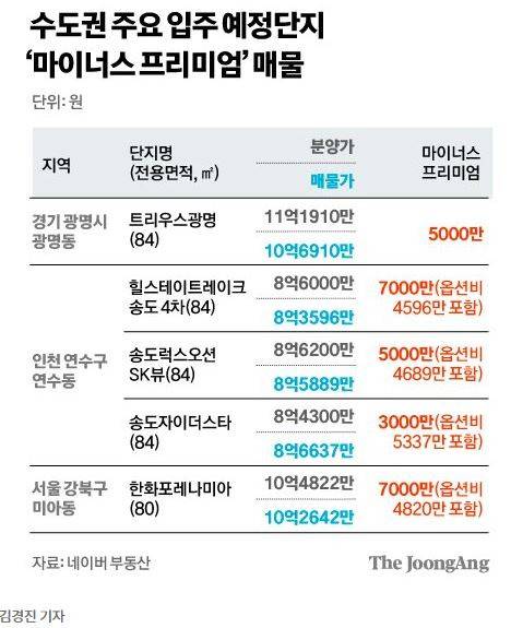 경기 광명시의 트리우스 광명 아파트가 다음 달 입주 예정인데요, 마피 5천이 붙어서 분양가(11억대)에서 10억대로 싸게 매물이 나왔어요. 송도나 미아동은 7천만원까지 떨어지네요.