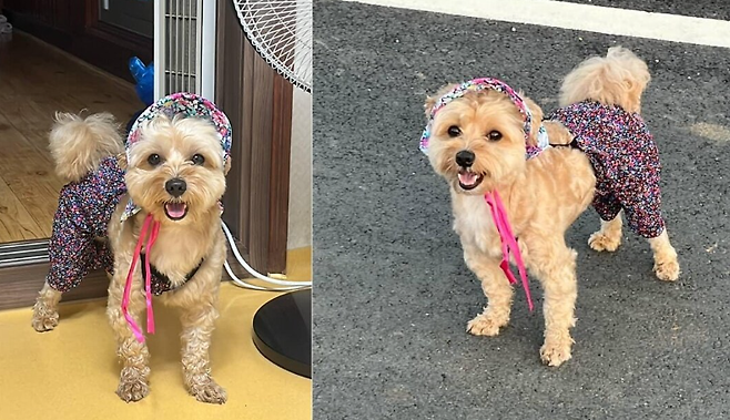 형이 돌볼 때는 빡빡이 미용에 정색하는 표정을 짓던 반려견 모카. 하지만 누나가 돌보면 부드러운 머릿결을 휘날리며 예쁘게 미용한 모습으로 활짝 웃습니다.